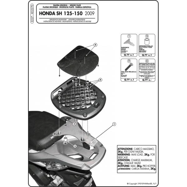 GIVI E227 Rear Plate Fitting Kit is a bike-specific kit to fit a Honda SH 125i and SH150i. The kit is designed to take GIVI Monolock top boxes only. Use this fitting kit in conjunction with the universal Monolock base plate which comes with the GIVI Monolock Top Box of your choice. Please note the maximum load allowed is 3 kg.