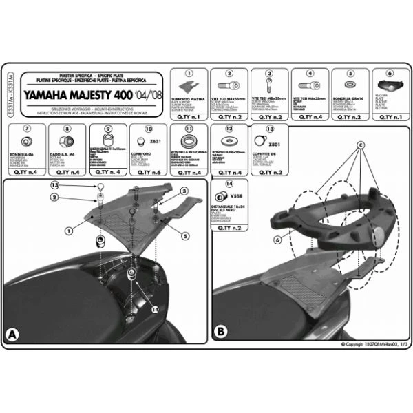 GIVI E331M Rear Plate is a bike specific rear plate kit for Yamaha Majesty 400 (2004-2014). The kit is designed to take GIVI Monolock Top Boxes only. All parts needed to mount the GIVI E331M Rear Plate are included. Installs quickly using simple hand tools.