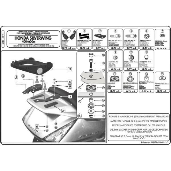 GIVI SR19 Rear Plate is a bike specific rear plate kit for a Honda Silver wing 400 (2006-2009) / 600 (2001-2009) and SW-T 400-600 (2009-2016). The kit is designed to take the GIVI Monokey top boxes only. All parts needed to mount the Givi SR19 Rear Plate are included. Installs quickly using simple hand tools.