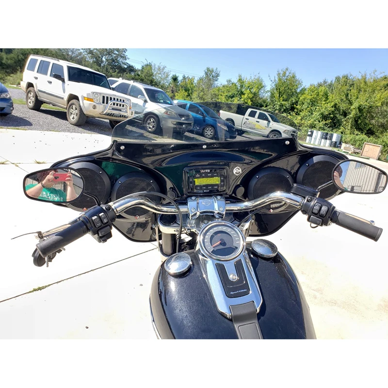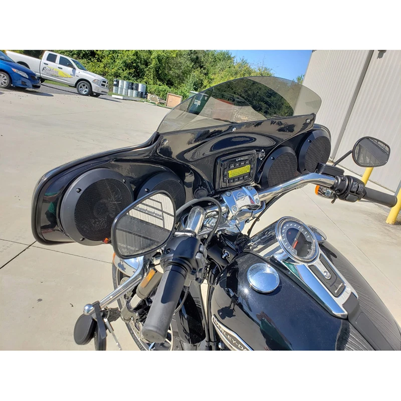 A combination of Rockford Fosgate speakers featuring 2 x 6.5″ speakers on the outsides of the fairing, and 2 x 5.25″ speakers on the inside. This pairing features a combination of rich bass from the 6.5″ speakers as well as crisp highs provided by the 5.25″ speakers. The ultimate speaker pairing for the highest level of sound in the classic fairing.