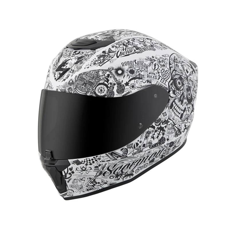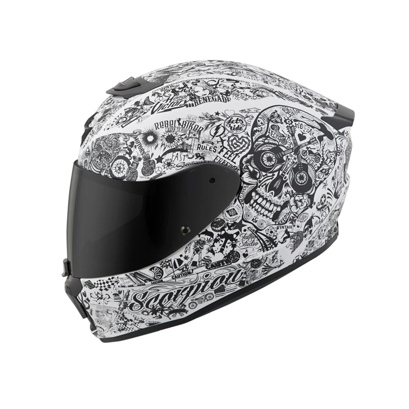 The EXO-R420 helmet continues to set a new standard for Scorpion EXO®’s full face street helmets at a very competitive price point. An all new advanced LG® polycarbonate shell is more aerodynamic and smaller resulting in an ultra lightweight SNELL-approved helmet. The aero tuned ventilation system uses a large top vent and mouth vents engineered to allow more airflow to the riders head while maintaining low noise levels. The EXO-R420 now features our new Elliptec™ II faceshield with a latching shield locking mechanism located in the lower center of the shield. This makes the faceshield more secure and provides a tighter seal against the gasket. The faceshield can easily be removed without tools, and the EverClear® No-Fog coating helps keep your vision clear in cold and damp environmental conditions. The KwikWick® II comfort liner is moisture wicking, anti-microbial, quick drying and can be easily removed and is machine washable.
