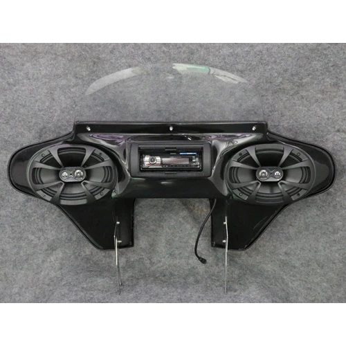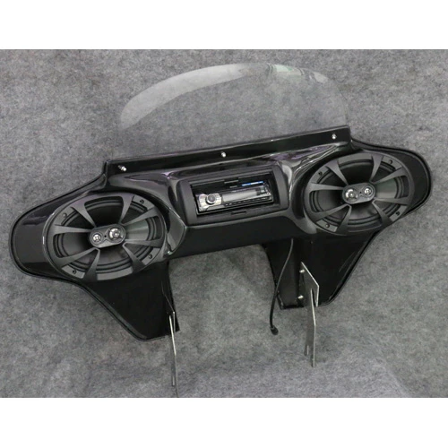 This Fat Bob Fairing specifically fits on the Fat Bob with stock 2 headlights, it gives your bike an unique and exclusive look, and features superior and powerful bass. It has more room inside the fairing which creates stronger bass from the 6×9 speakers. The fairing comes with powerful Nakamichi stereo and a pair of water proof 6″x9″ speakers with 20 oz magnet each, definitely it will bring you the sound you are pursuing for your ride.